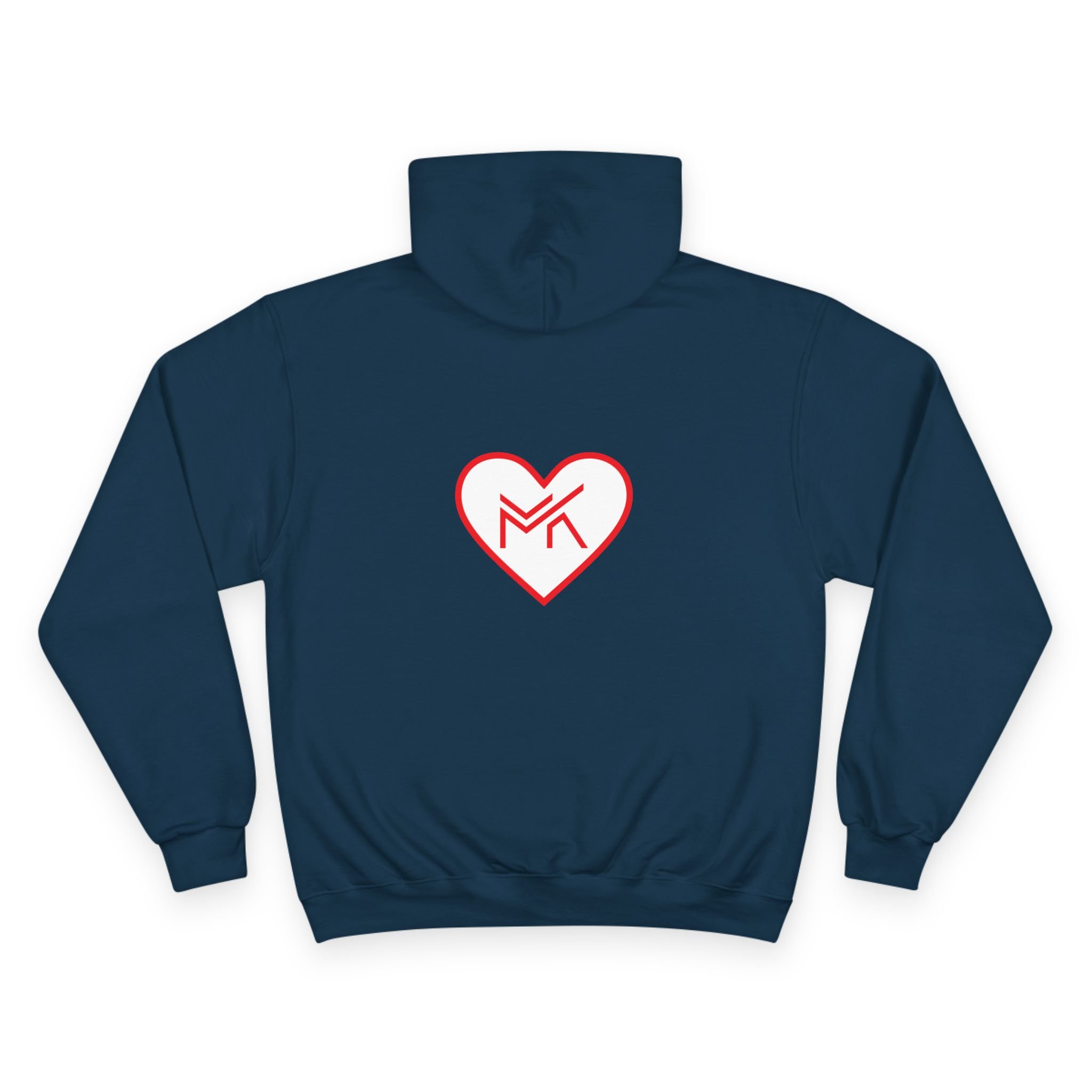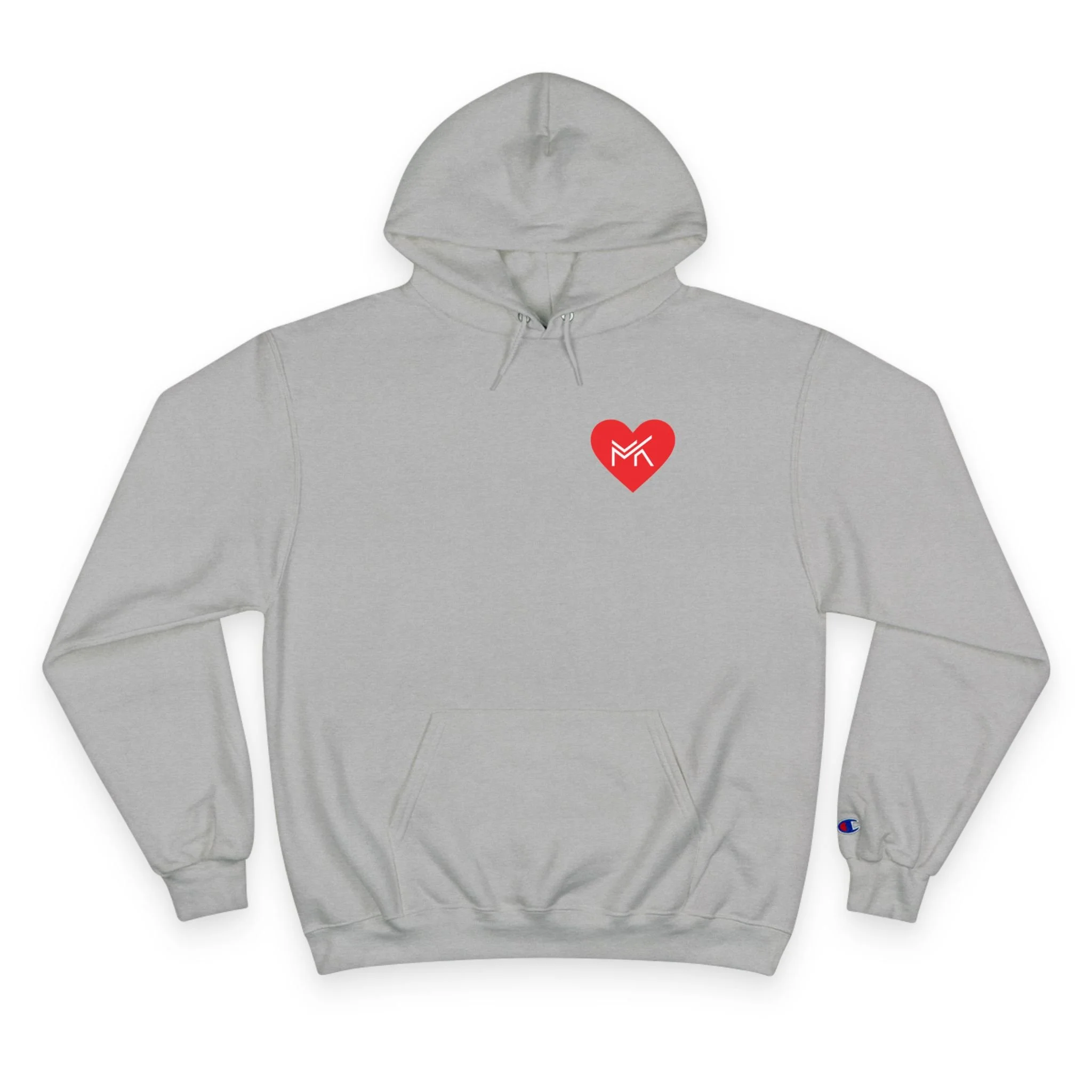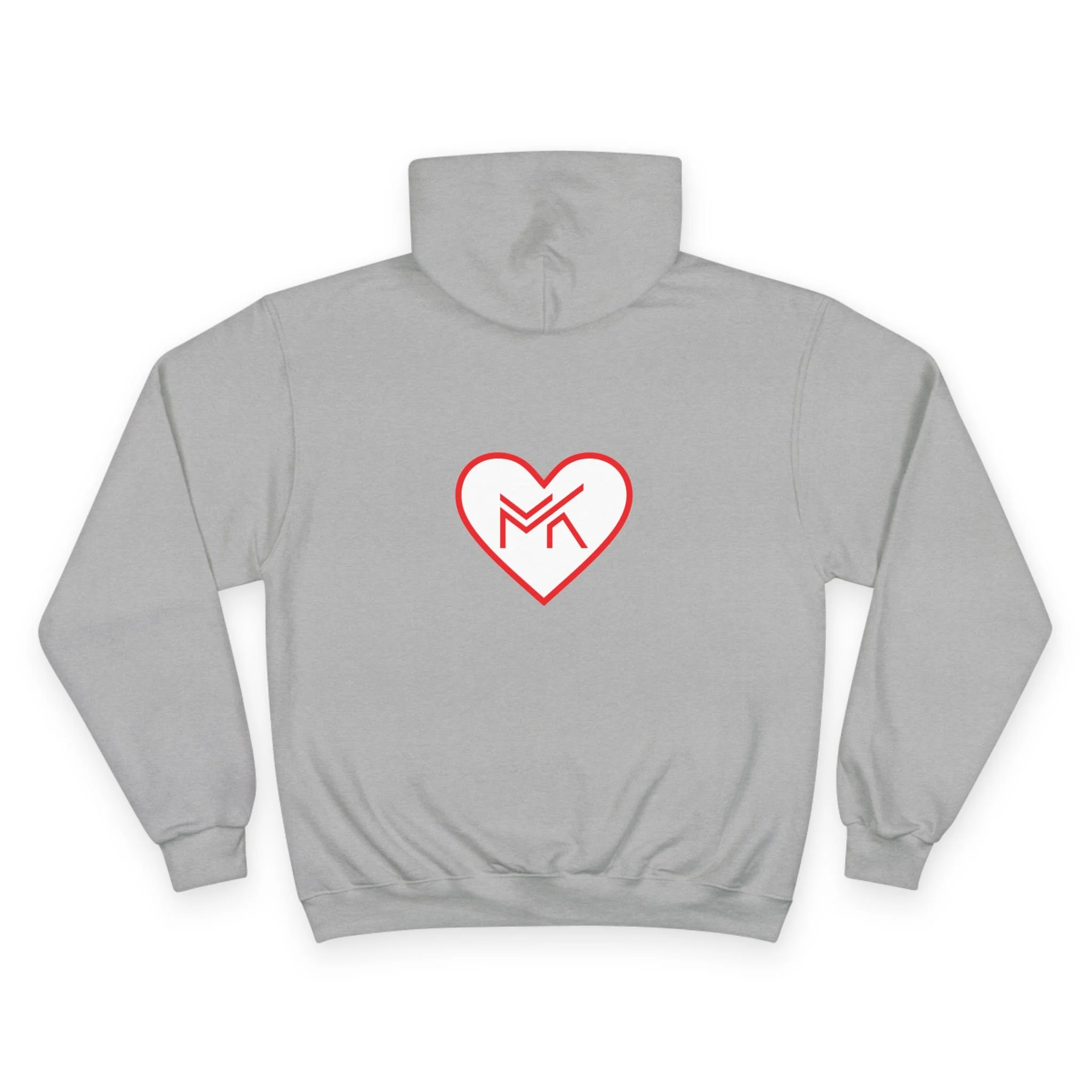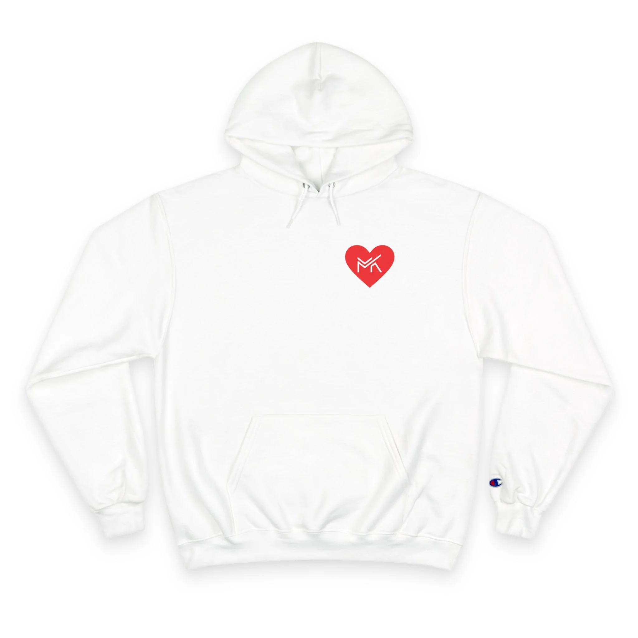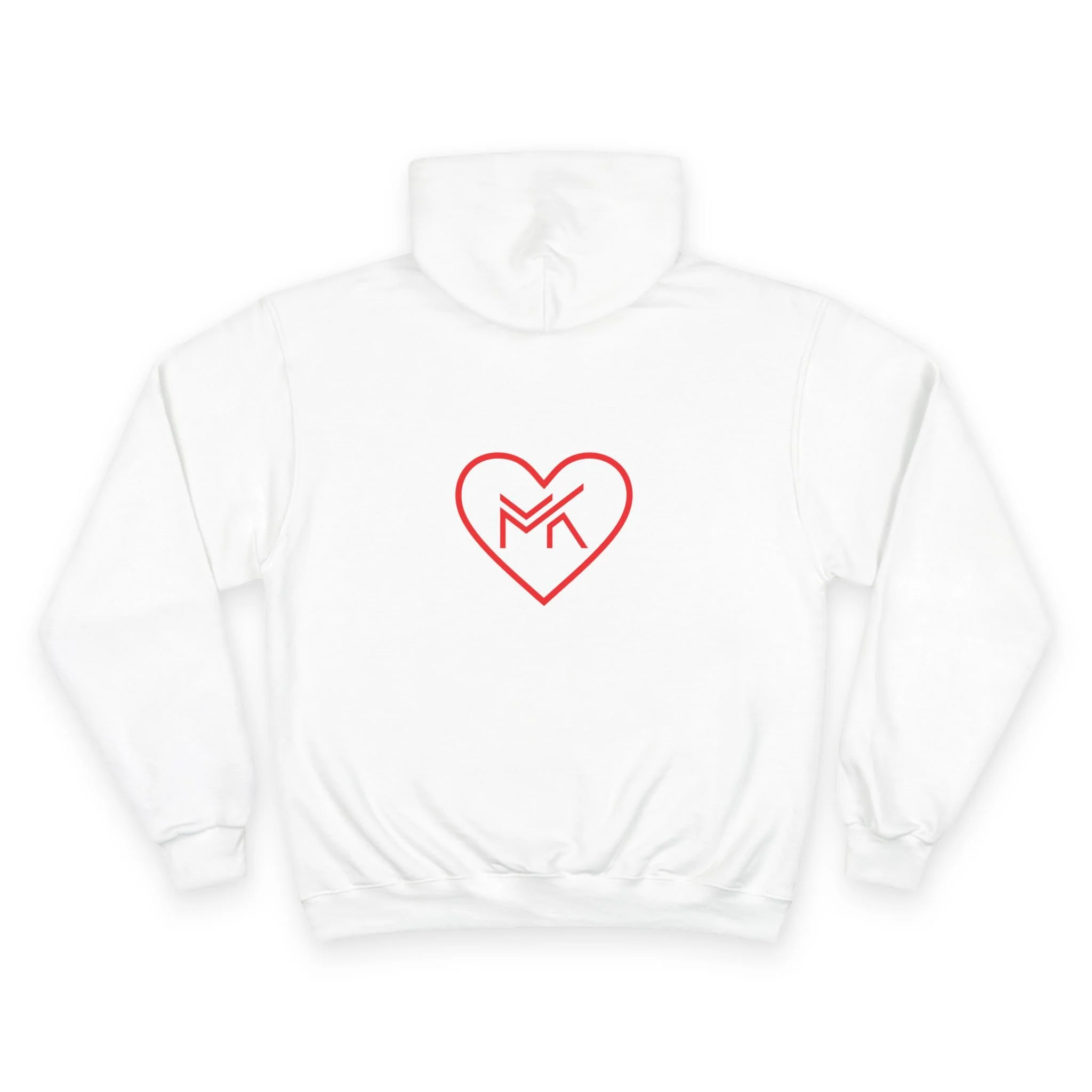 Heart MK Hoodie — White Champion Pullover with Red Heart MK Emblem