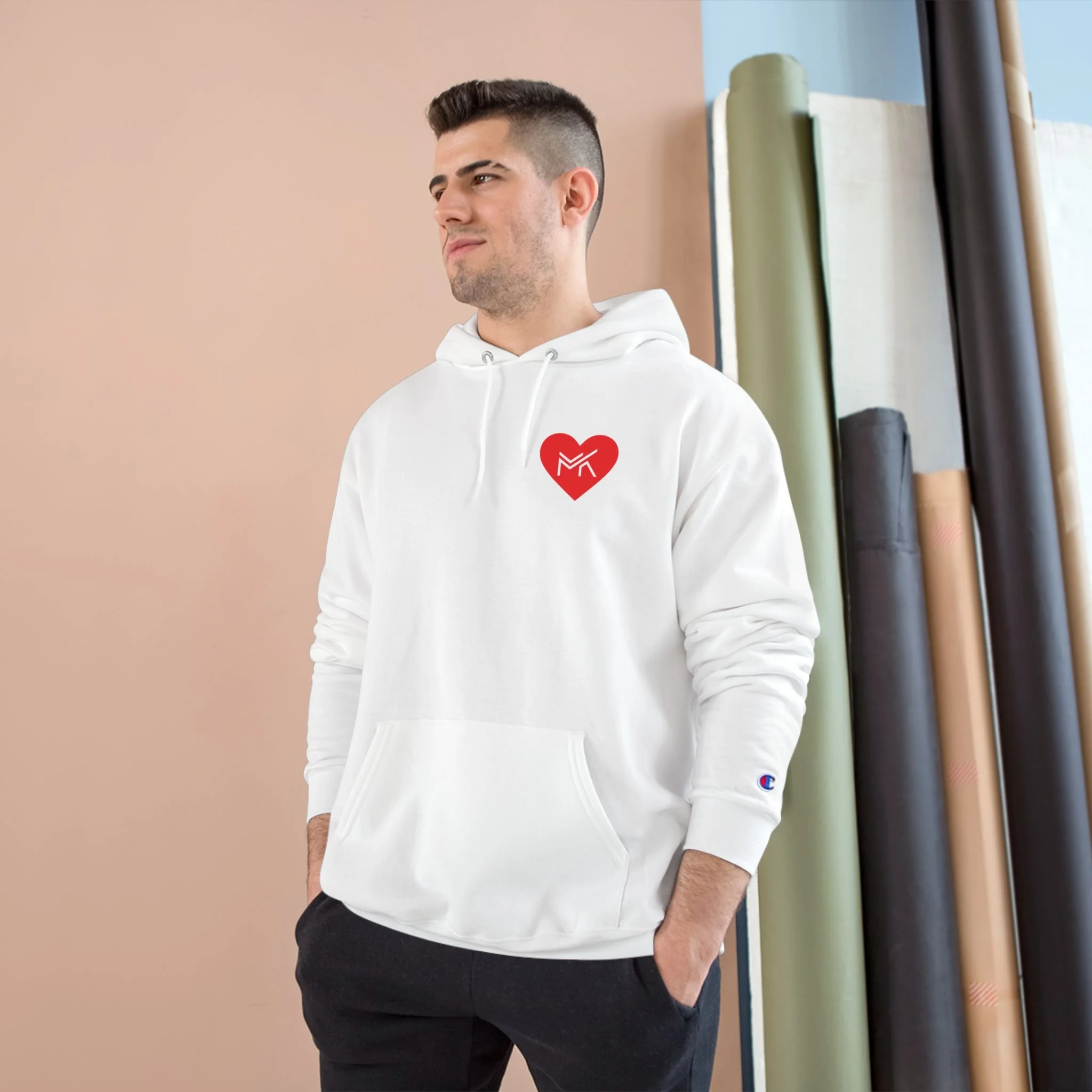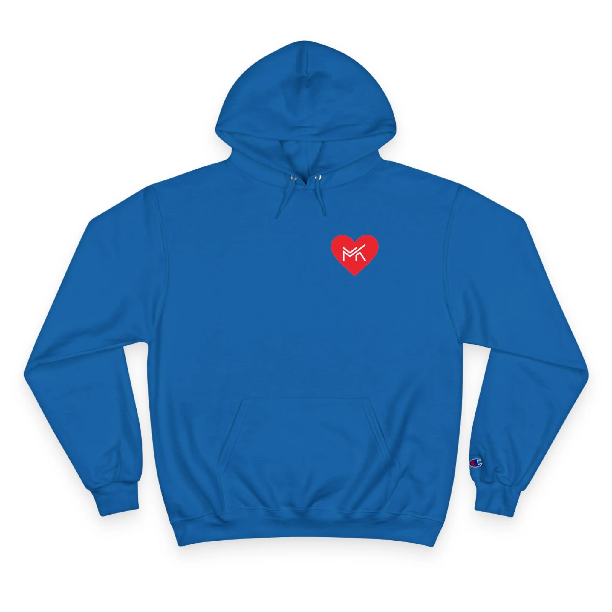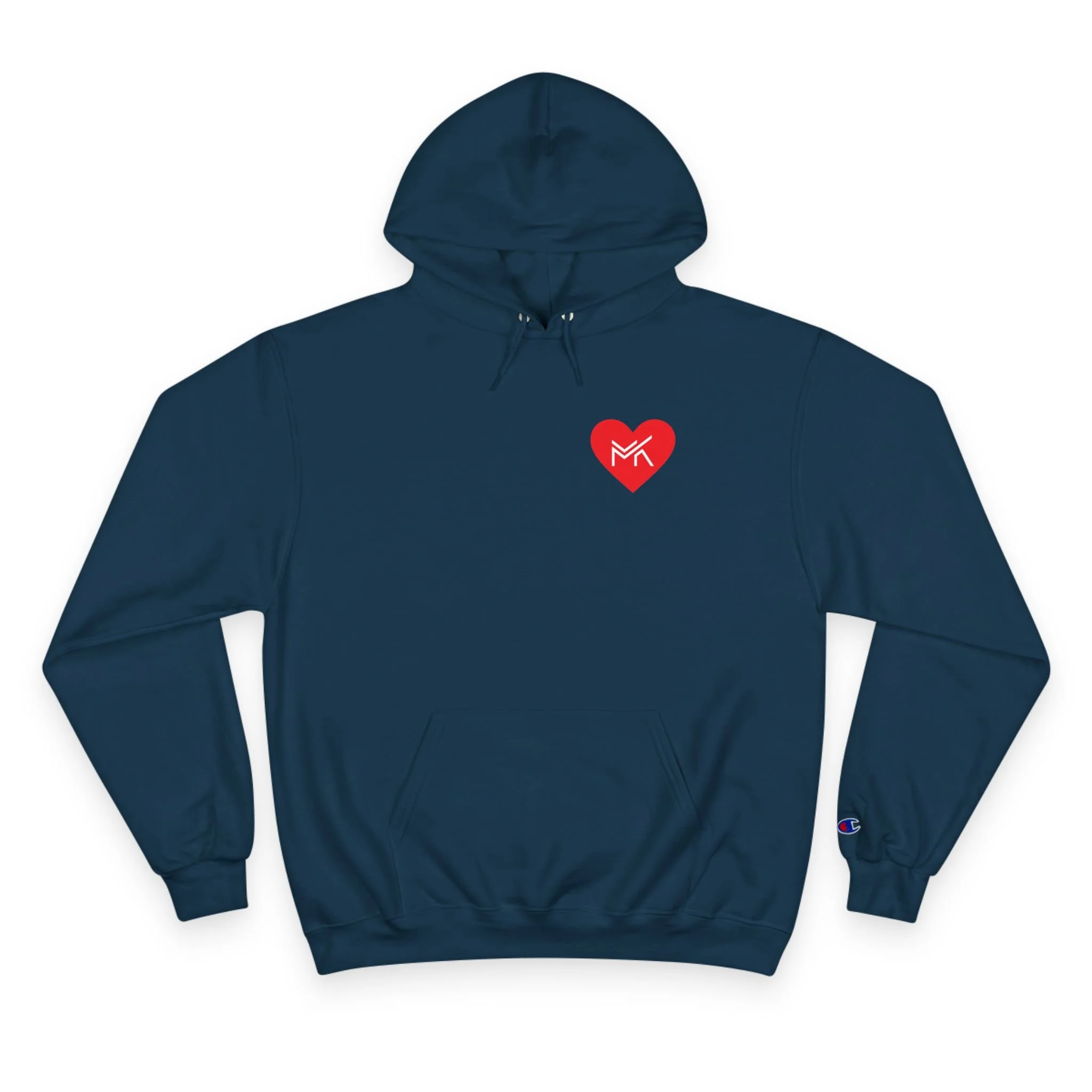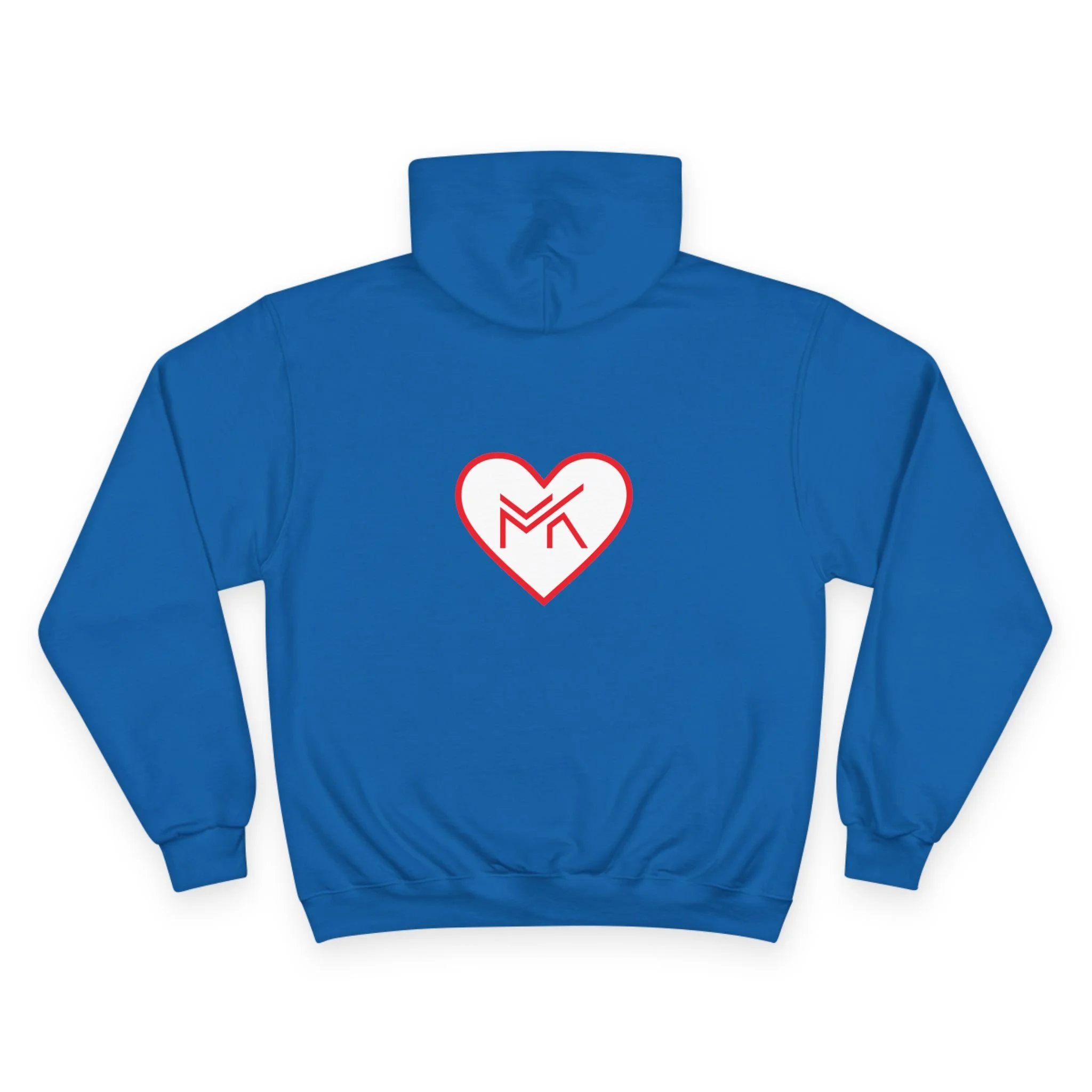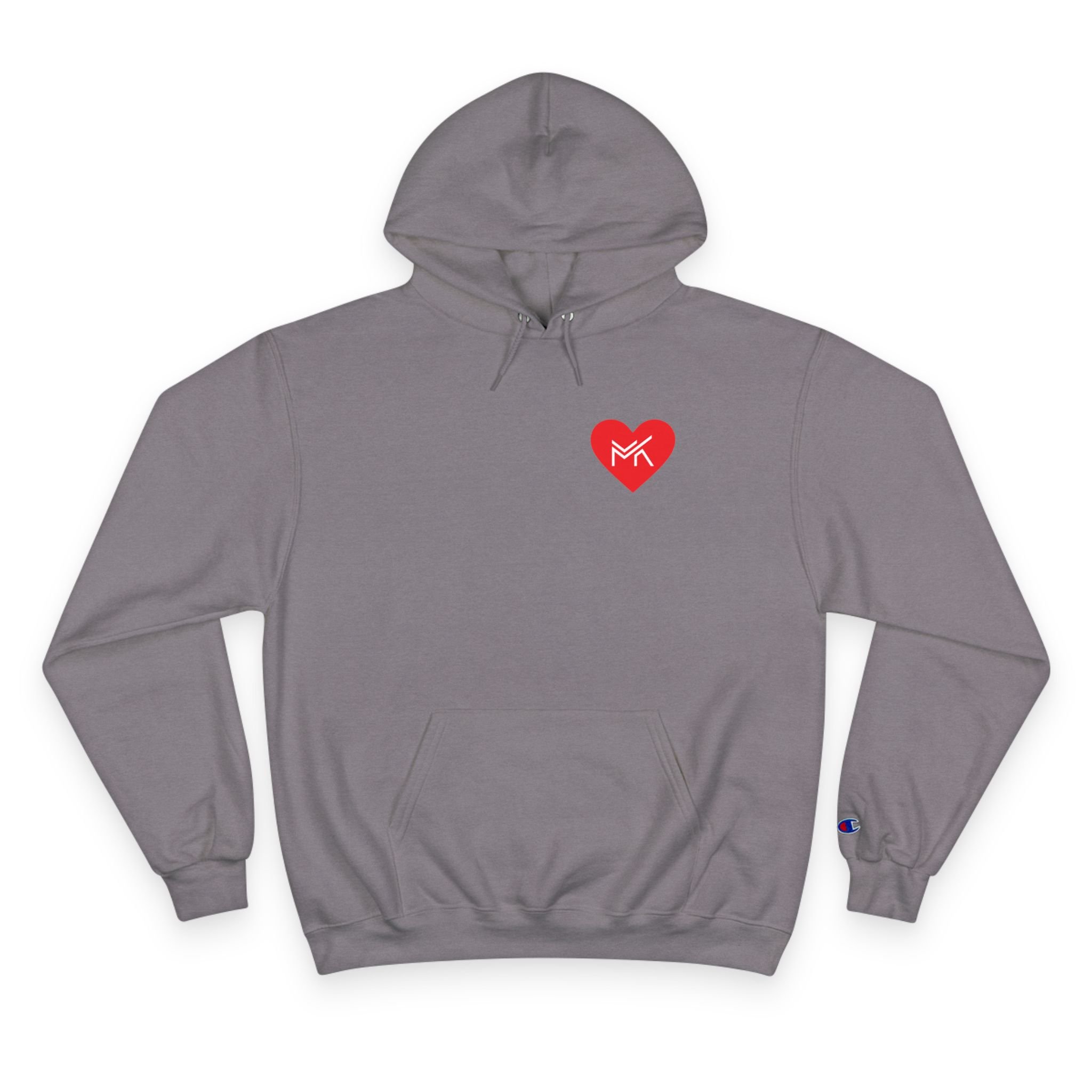 Heart MK Hoodie — White Champion Pullover with Red Heart MK Emblem